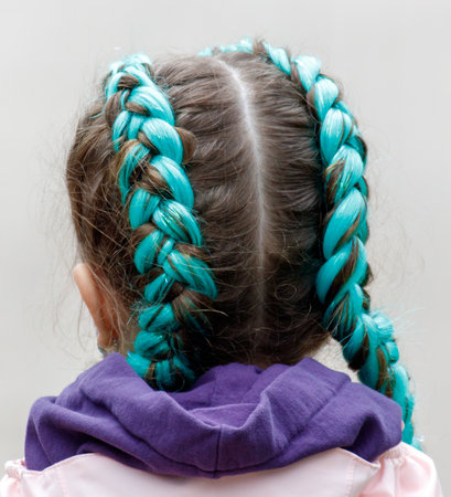Girl with pigtails, two braids with the addition of artificial material in pink cool