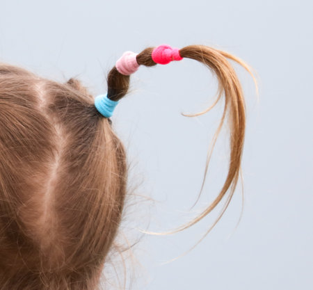 A girl with a ponytail has a bunch of colorful hair ties in her hair. The hair ties are in different colors and are scattered throughout her hair