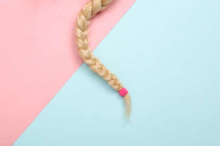doll hair braid on a blue pink pastel background. Hair care, minimalistic beauty concept