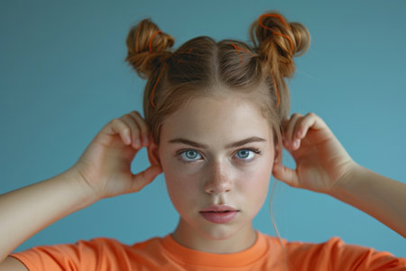 Young girl in orange tshirt covering ears with hands on head with expression of discomfort