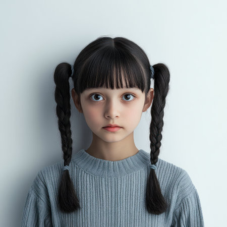 A girl with two braids in a soft sweater stands against a pale background, gazing ahead.