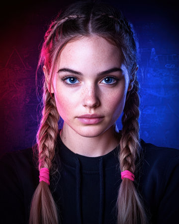 Child with vibrant, colorful braids, standing against a dark blue background, capturing the essence of youthful innocence and beauty
