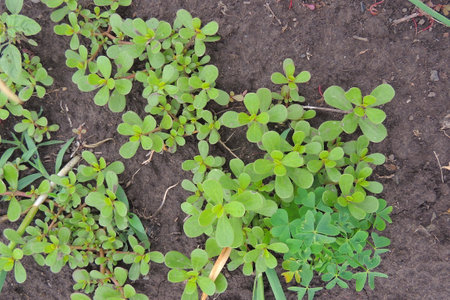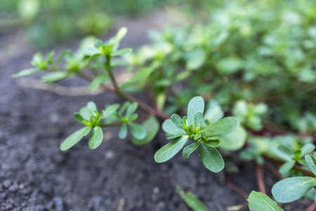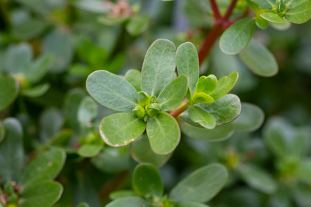 Close up shot of Portulaca oleracea plant in the garden. Benefits of Portulaca concept
