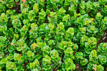 top view of beautiful red flowers with small green leaves on background in sunlit outdoors, abstract textured graphic resource for nature designs with copy space.