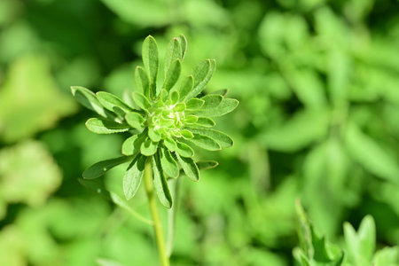 The beautiful deep green background of the aster flower at the beginning of the bloom. Selective focus, natural botanical concept.