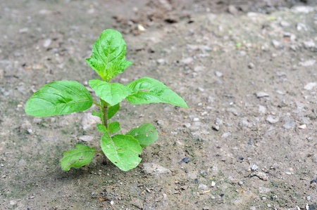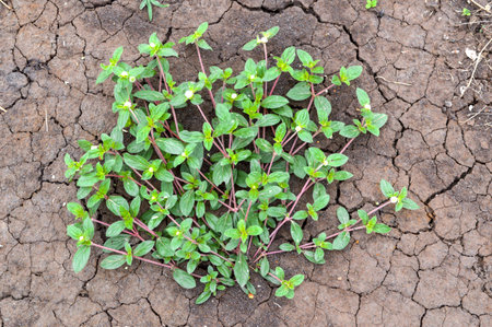 Close up of plant stem grows on cracks dry cracked surface