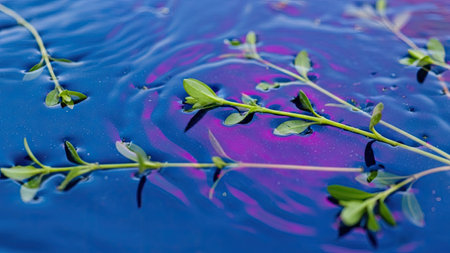 Water drops on the surface of the water with green plants and ripples