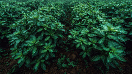 A panoramic wide view of Madder field growing closely together after rain wet leaves reflecting soft light fresh soil visible ultra realistic photography cinematic wide composition lifelike natural scene