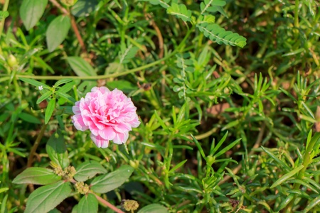 Pink Portulaca on a leaves green background.