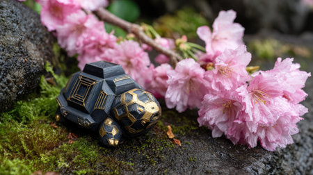 Small, intricately designed turtle figurine, featuring geometric shapes and a black and gold color scheme, is situated amongst a collection of pink blossoms. The figurine rests on a bed of moss and rocks, with visible water droplets on the flowers.