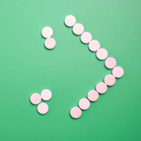 White pills on a green background. medical theme. selective focus. Side view of a pile of tablets.