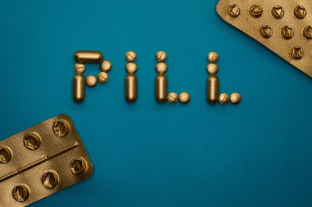 Blisters with pills, for health and protection. Yellow color with green capsules, white, sealed in silver packages on a blue background. Slimming, anti-aging or anti-virus products. Contraceptive