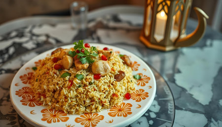 Indulge in a vibrant biryani dish beautifully plated with aromatic spices and fresh ingredients, capturing the essence of culinary artistry in a cozy kitchen.