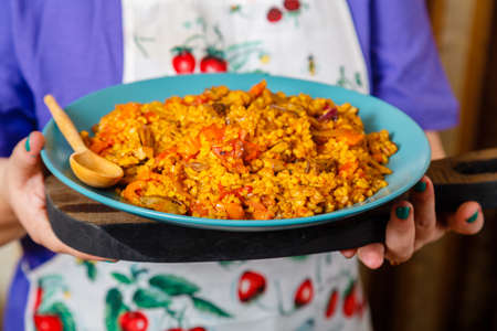 Rice with meat, national Uzbek cuisine, national dish of pilaf, street food in cafe in Ukraine