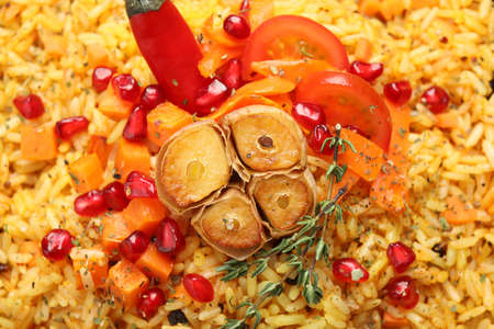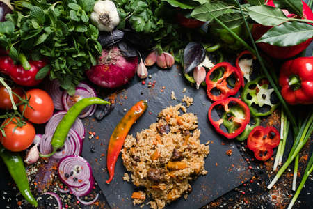 Traditional Uzbek cuisine plov dish vegetable background. Healthy food eating and proper nutrition concept