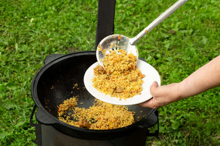 The chef puts delicious traditional Asian plov on a plate, cooked outdoors on a mobile wood-fired oven