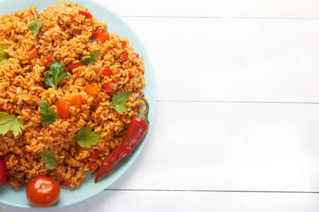 Jollof rice, tomatoes and hot peppers on a blue plate on a white background. national cuisine of africa. copy space.