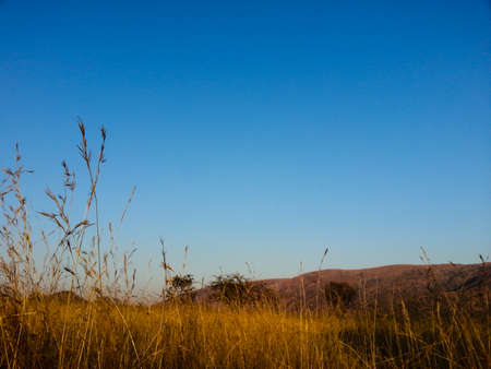 Panorama from Pilanesberg National Park, South Africa. Dry grass at twilight. Safari in Africa
