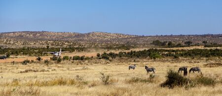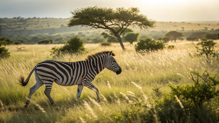 Zebra walking in the African savannah of South Africa these herbivorous animals are often seen on safari, they live the African wildlife with the danger that comes with big predators.