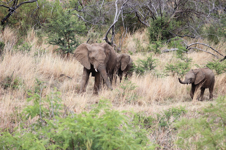 A small elephant herd wandering in the grasslands of South Africa's Pilanesberg National Park