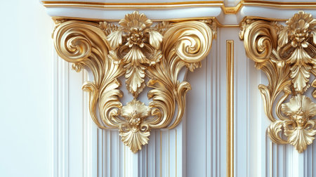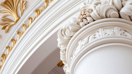 Detailed view of a white archway featuring intricate carvings and gold embellishments