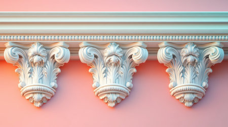 Intricate Corinthian capitals adorn a soft pink wall, showcasing exquisite craftsmanship and classical design elements.