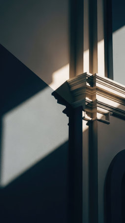 Architectural details of classic columns highlighted by warm sunlight in an urban setting