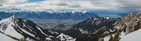 Beautiful mountain panorama from Leysin range on a cloudy winter day. Looking towards Lac Leman and Lausanne.