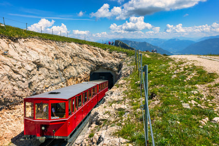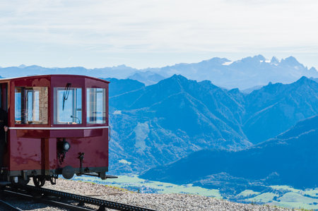 Colorful Cogwheel Rail Car Climbing Mount Pilatus Lucerne Switzerland. Steepest cogwheel railway in World, climbing to Mt. Pilatus observation point