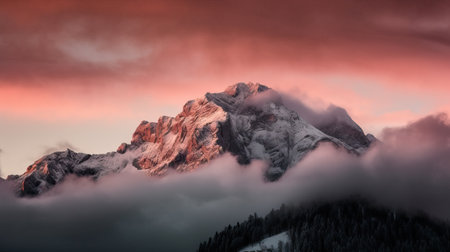 Aerial view of a mountain covered in fog under the beautiful pink sky. Generative AI AIG21.