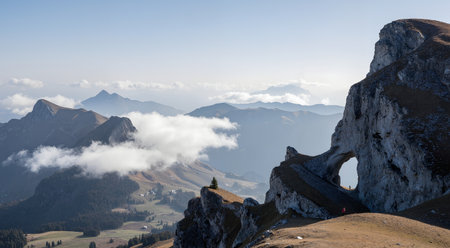 Beauftiful majestic sunrise in the Swiss Alps covered in clouds.