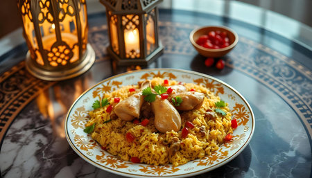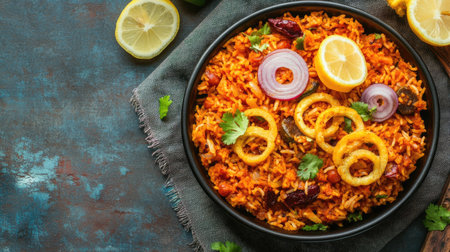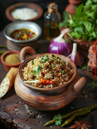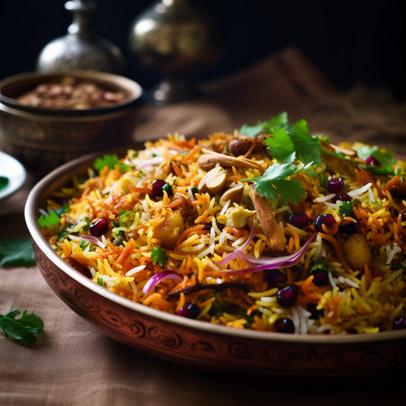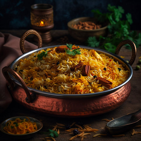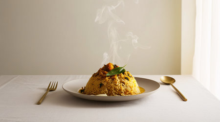 Indulge in a vibrant biryani dish beautifully plated with aromatic spices and fresh ingredients, capturing the essence of culinary artistry in a cozy kitchen.