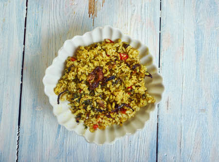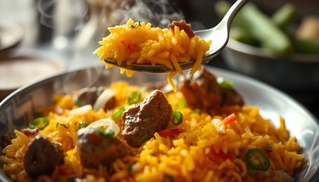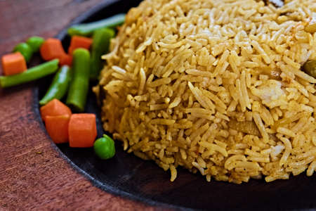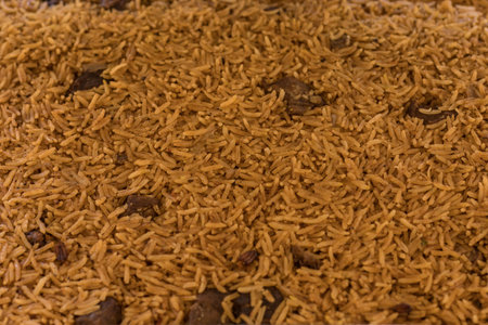 Close up of indian spicy biryani or yellow rice.