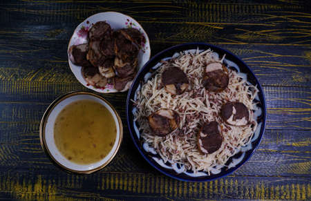 Uzbek cuisine (food) pilaf (plov ) salad achichuk .Mutton, rice, carrots, vegetable pepper, cumin