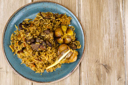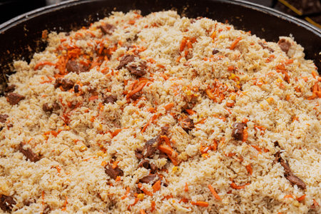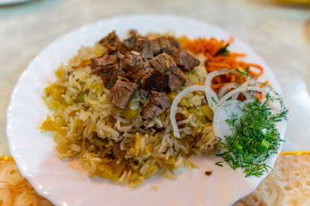 Rice with meat, national Uzbek cuisine, national dish of pilaf, street food in cafe in Ukraine