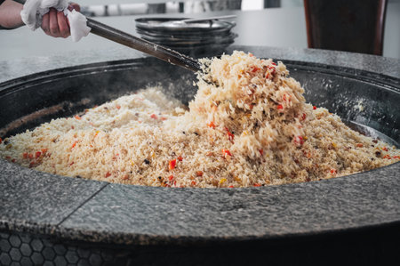 Cooking Uzbek pilaf in cauldron during street food festival