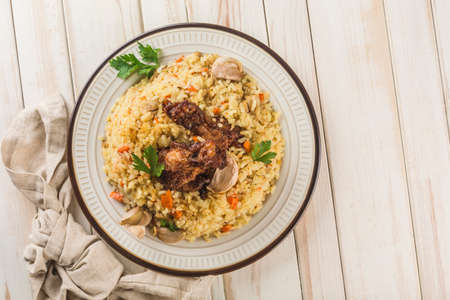 Chicken pilaf in a light plate with baked garlic, fresh herbs and a napkin on a white wooden background. A traditional eastern dish. Top view. Horizontal orientation with a copy space for the text.