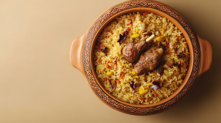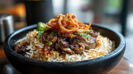 A vibrant rice dish featuring tender meat, beautifully arranged in a traditional bowl. Perfect for showcasing authentic culinary delights at any meal.