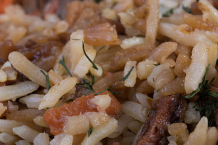 Asian pilaf with vegetables raisins and herbs close-up