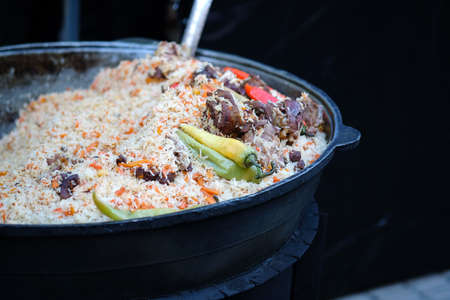 Rice with meat, carrots in a large cauldron. Pilaf with spices during the Christmas market. Street food - pilaf in a black pot.