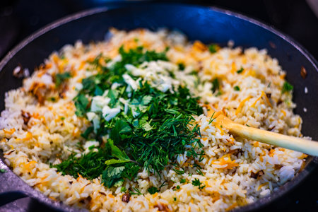 Fresh cooked vegetarian rice with herbs