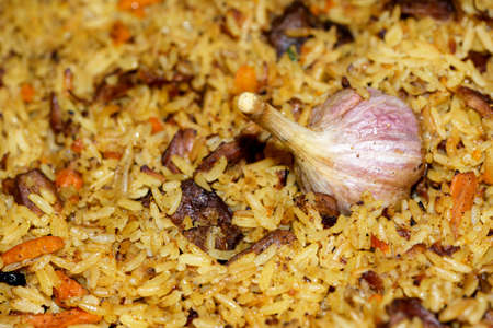 Delicious aromatic pilaf with lamb and garlic