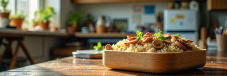 Sunlit kitchen with aromatic dish of couscous and sausages on rustic table. That the image is generated using AI.