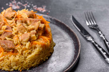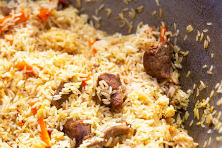 Pilaf with beef, carrots, onions, garlic, pepper and cumin. A traditional dish of Asian cuisine. Selective focus
