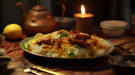 Special Mutton kacchi biryani Rice with chili onion lime on a plate. Traditional Indian cuisine. Briani. Multicolored rice in a plate