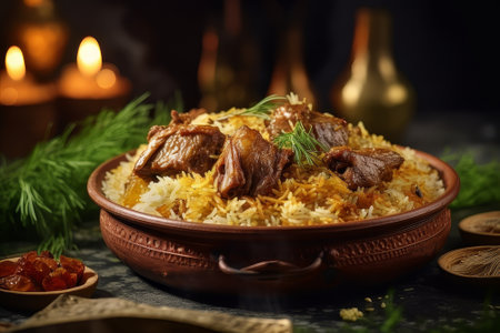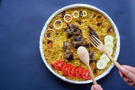 Traditional Kebuli Rice with Lamb, aromatic spiced rice dish cuisine, served with tender meat, raisins, cucumber, onion, seasoning and fresh tomato slices