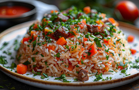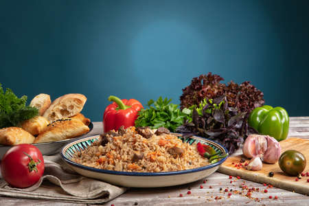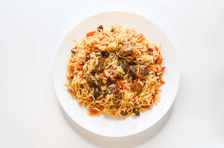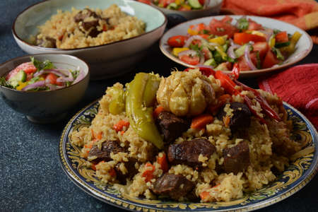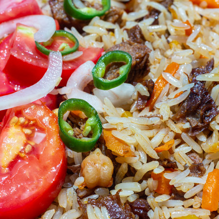Appetizing Uzbek pilaf with meat and vegetables. High quality photo