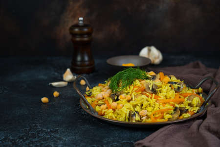 Vegetarian pilaf with mushrooms, vegetables and chickpeas on the right on a black background. Horizontal photo with copy space.