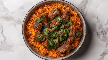 A mouthwatering plate featuring tender beef stewed in rich sauce over fluffy orange rice, beautifully garnished with fresh herbs, perfect for any gathering.