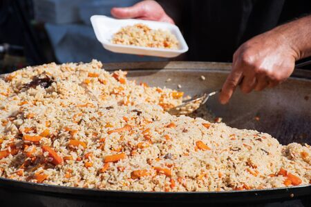 In street food festival, Uzbek pilaf is being prepared in cauldron